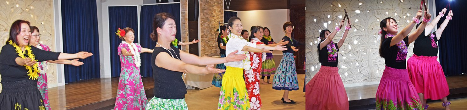 阿倍野・天王寺校、尼崎・伊丹校のみんなが参加して、新年会を行いました。外部団体と行うイベントには普段参加していない生徒さんや、去年入った生徒さんも、この日は思い思いの服装で参加、フラを踊りました。