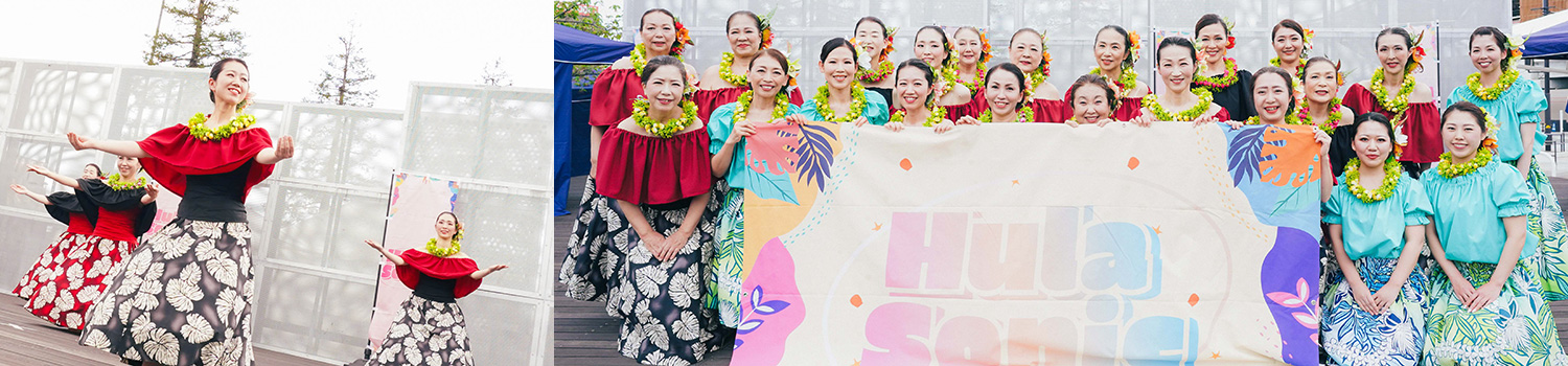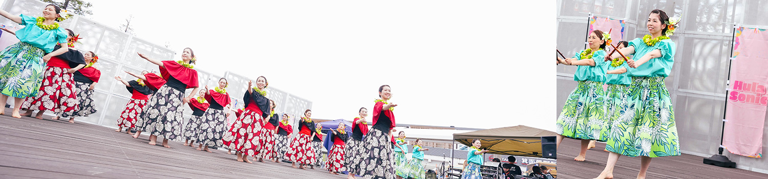 今回は、初めてイベントに出演するフラシスターズが多く、この日に向けて真剣に取り組みました。先輩の皆さんも親切に教えてあげていて、とても楽しいイベントになりました。当日は汗ばむ陽気で、会場の箕面茅野駅前広場にはハワイの物品を販売するブースも並び、一日ハワイアンソングが流れました。